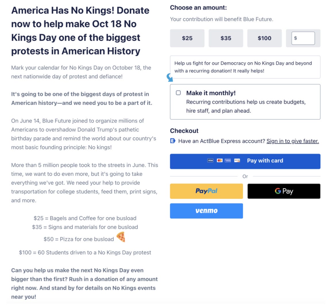 The progressive group Blue Future, a project of a hybrid federal PAC called the Youth Progressive Action Catalyst (YPAC), is asking for donations right now so it can raise funds to transport college students to their nearest No Kings protest on October 18th.