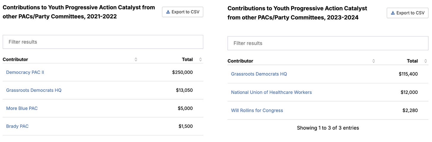 Interestingly, the biggest contribution YPAC ever received from another PAC or Party Committee was a $250,000 donation from George Soros’ Democracy PAC II in the 2021-2022 spending cycle; the second biggest contribution, $115,400, came from California-based Grassroots Democrats HQ in the 2023-2024 spending cycle.